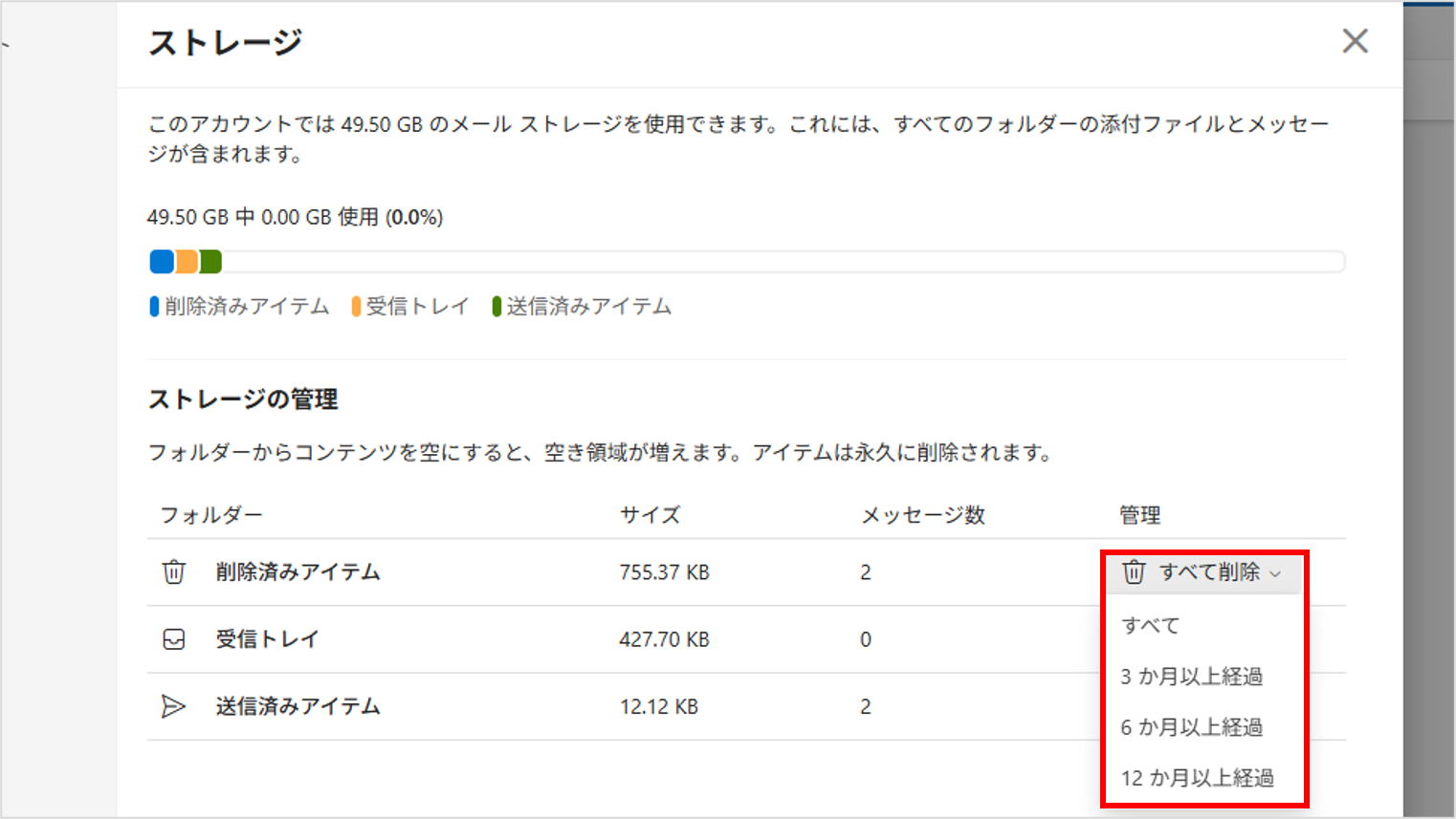 各フォルダ名の横にある 「空にする」 ボタンを押すと、「3か月以上前のメールだけ削除」「1年以上前のメールだけ削除」といった条件を指定して、古いメールを一括整理できます。