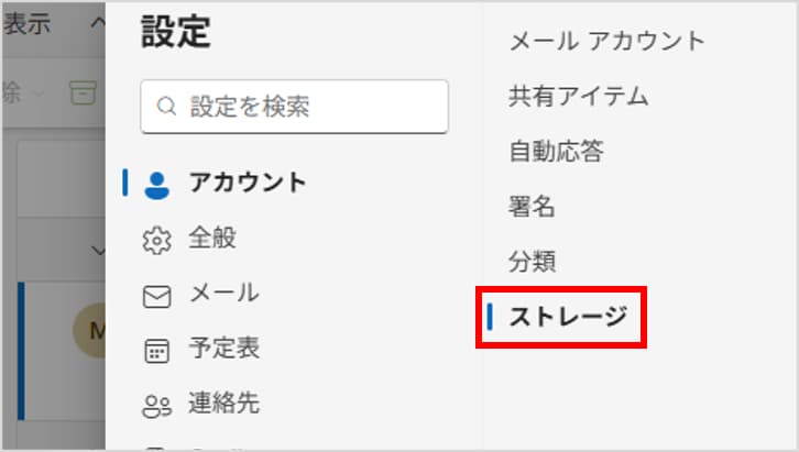 新しいOutlookでは、「設定(歯車)」>「全般」>「ストレージ」から簡単に容量を確認できます。
