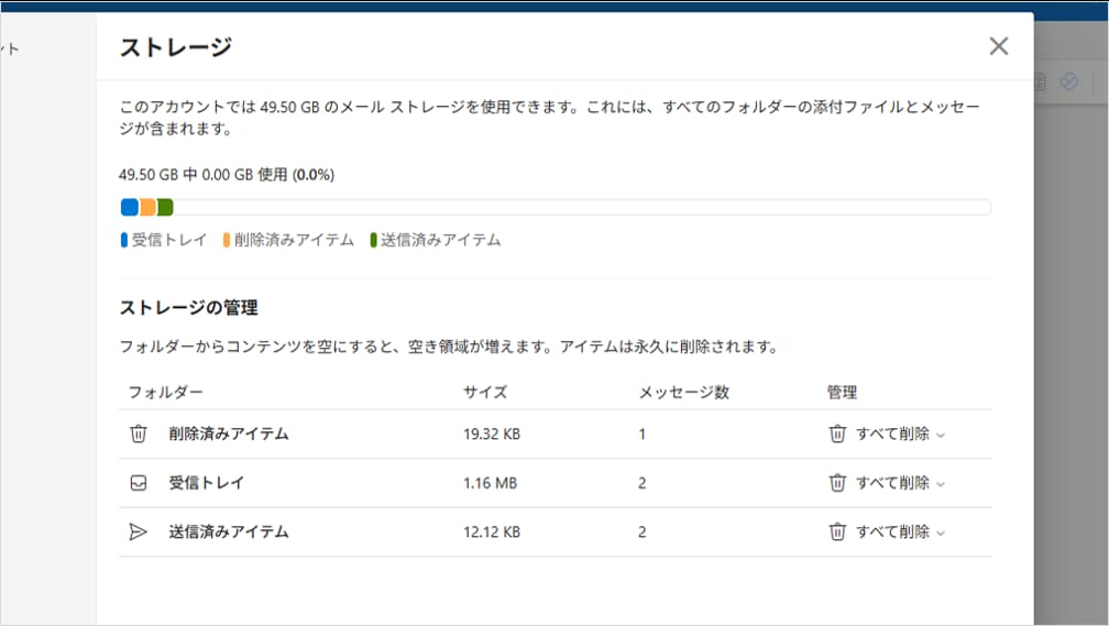 この画面では、「受信トレイ」「送信済みアイテム」「削除済みアイテム」など、どのフォルダが容量を食っているかの内訳も一目で確認できます。