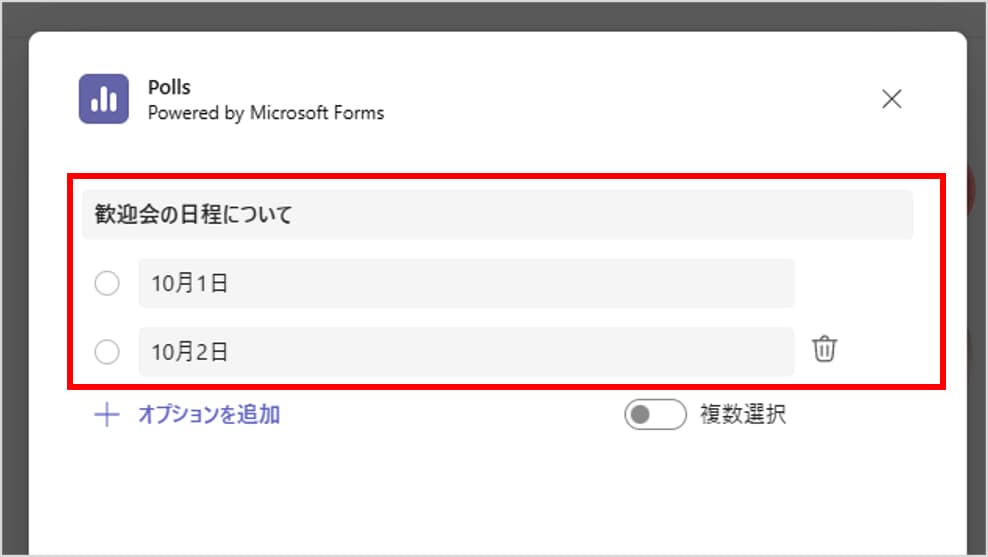 - 質問: アンケートのタイトルを入力(例:歓迎会の日程について)