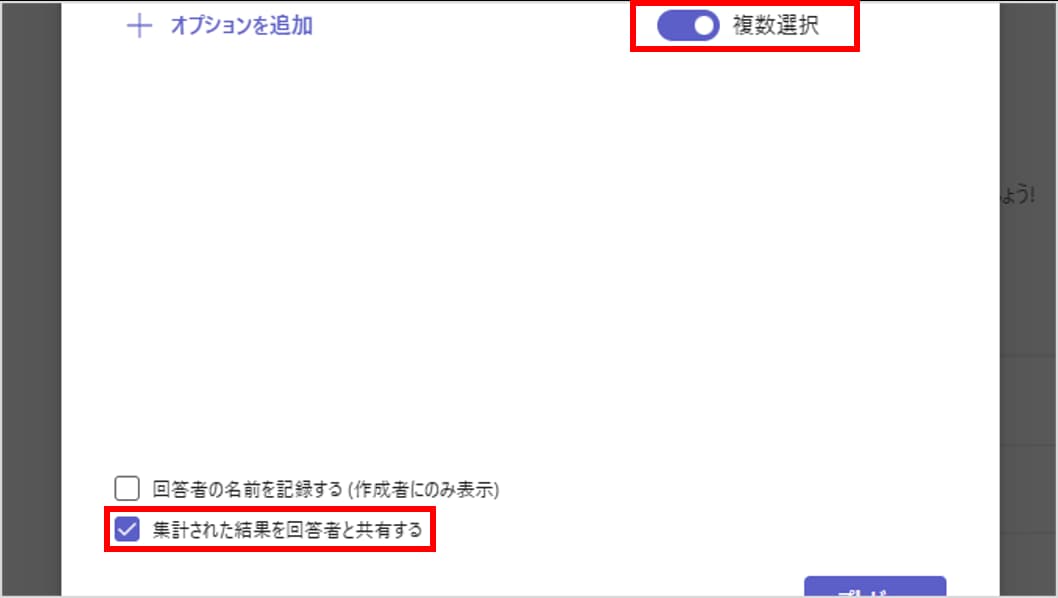 「複数回答を許可する」をオンにすると、1人で何個でも選べるようになります。 - 結果の共有: