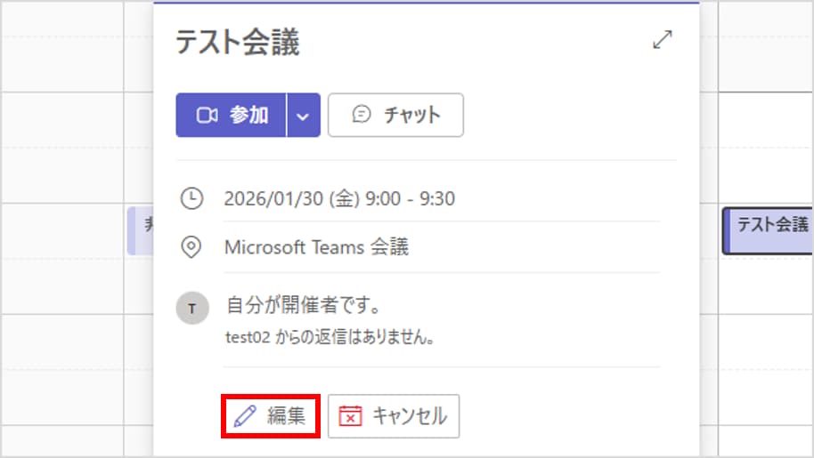 Teamsのカレンダーから対象の会議を開き、「編集」をクリックします。