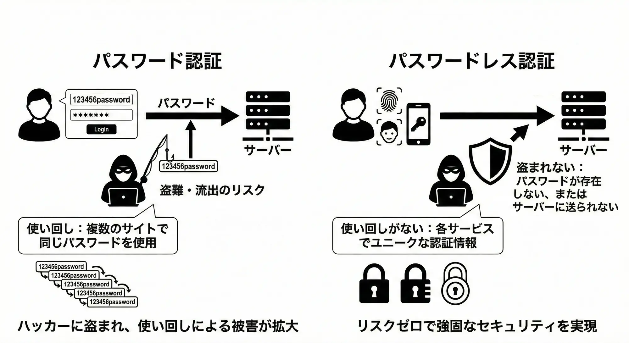 パスワードレス認証は「パスワード入力を完全に排除」するため、より利便性が高く、セキュリティも強固になります。