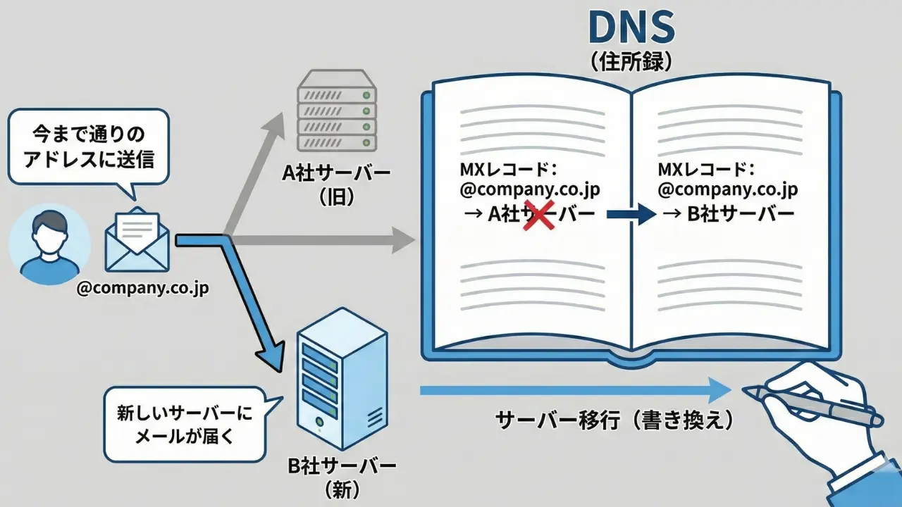 サーバー移行とは、この住所録を「A社ではなく、新しく契約したB社のサーバーに届けてください」と書き換える作業のことです。