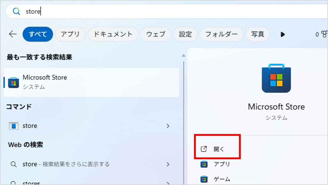 検索窓に「Store」と入力し、「Microsoft Store」 アプリを開きます。