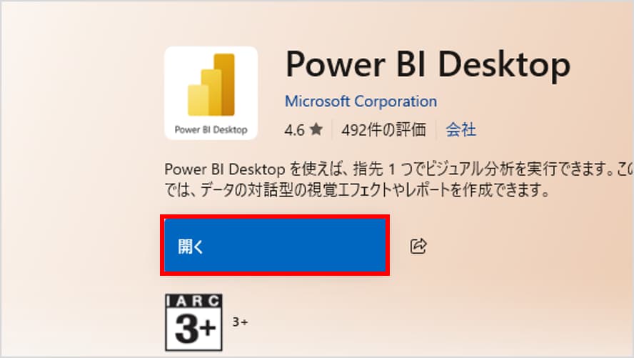 「Power BI Desktop」アプリが表示されたら、「入手」(または「インストール」)ボタンをクリックします。