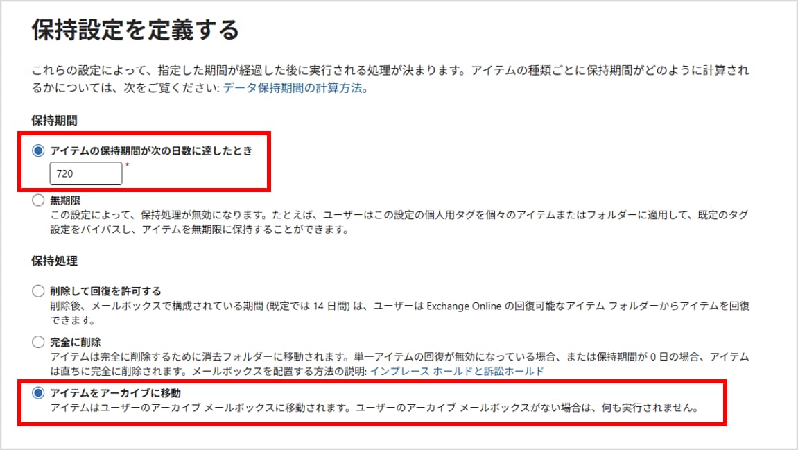 「2年経過したメールは自動的にアーカイブへ移動する」といった「保持ポリシー(MRMポリシー)」を管理者が設定できます。
