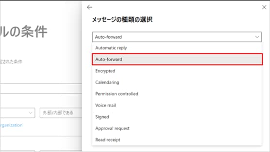 「メッセージのプロパティ...」>「メッセージの種類を含める」>「自動転送(Auto-forward)」を選択