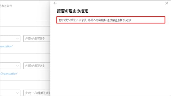 拒否の理由として「セキュリティポリシーにより、外部への自動転送は禁止されています」などのメッセージを入力します。