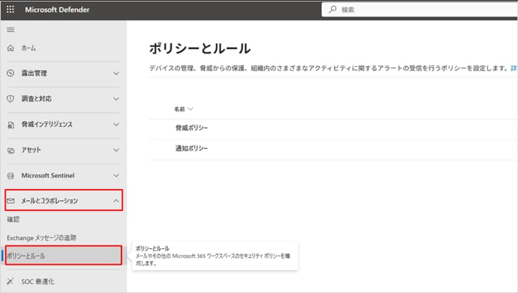 左側のナビゲーションから 「メールとコラボレーション」 > 「ポリシーとルール」 をクリックします。