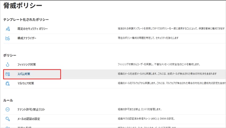「脅威ポリシー」 > 「スパム対策(Anti-spam)」 の順に選択します。