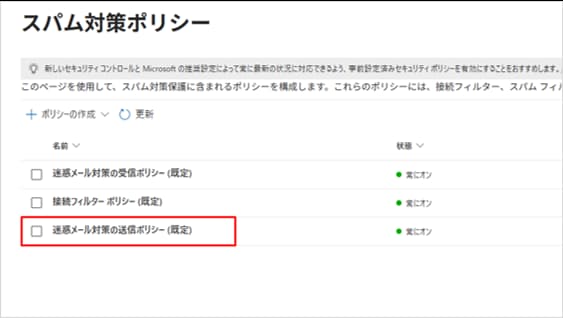 ポリシーの一覧から 「迷惑メール対策の送信ポリシー (既定)」(Anti-spam outbound policy (Default))をクリックします。