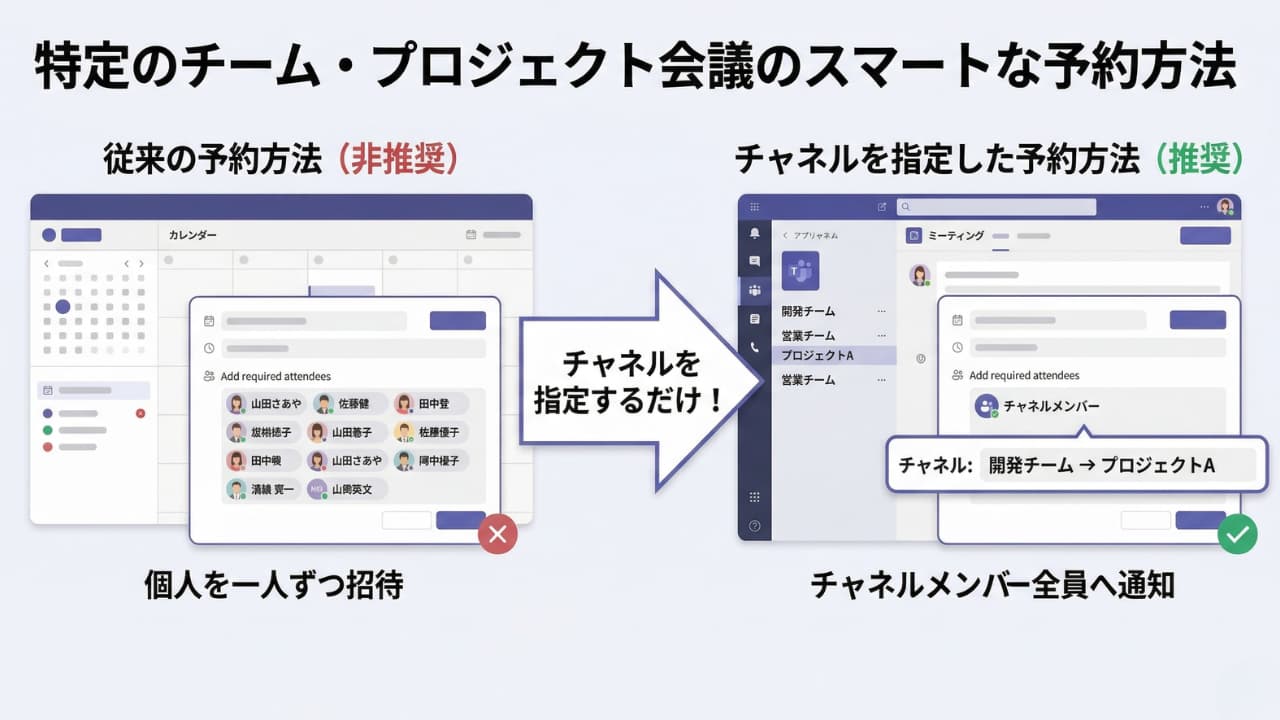 特定のチームやプロジェクトのメンバーが集まる会議なら、カレンダーから単に人を呼ぶのではなく、Teamsの「チャネル」を指定して会議を予約しましょう。