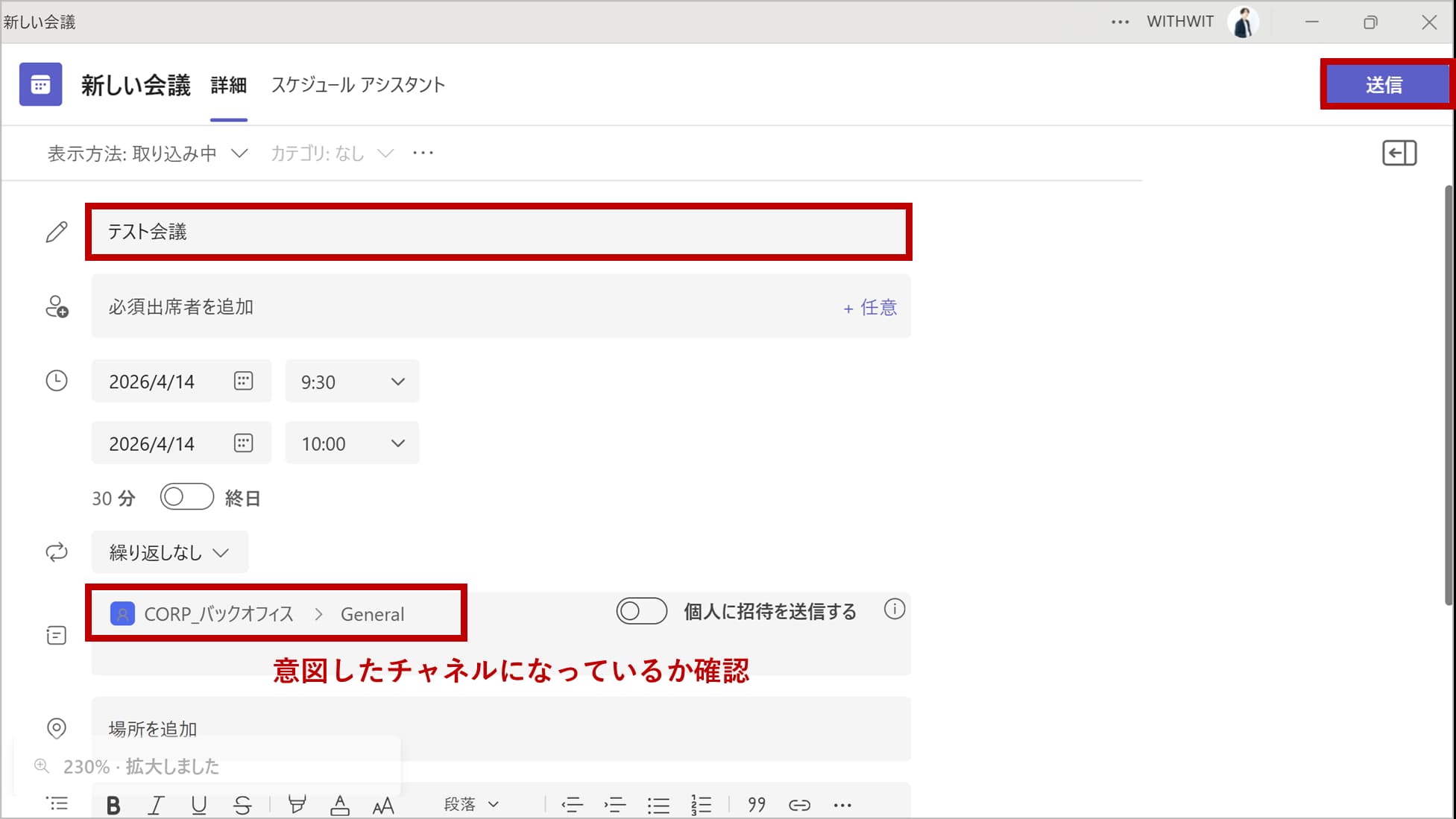 タイトルを入力し、意図したチャネルになっているか確認後、「送信」をクリックして完了です!