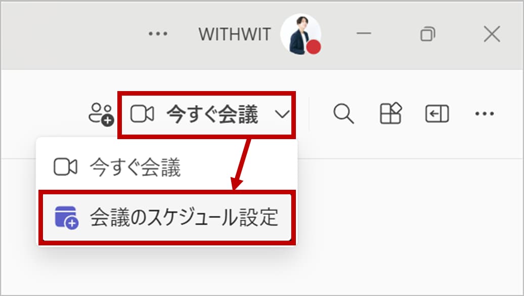 開催したいチャネルの画面から、「今すぐ会議」>「会議のスケジュール設定」をクリックして作成画面を開きます。